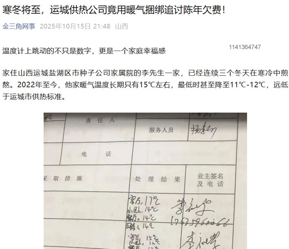 家住山西运城盐湖区市种子公司家属院的李先生一家,已经连续三个冬天在寒冷中煎熬。2022年至今,他家暖气温度长期只有15℃左右,最低时甚至降至11℃-12℃,远低于运城市供热标准。